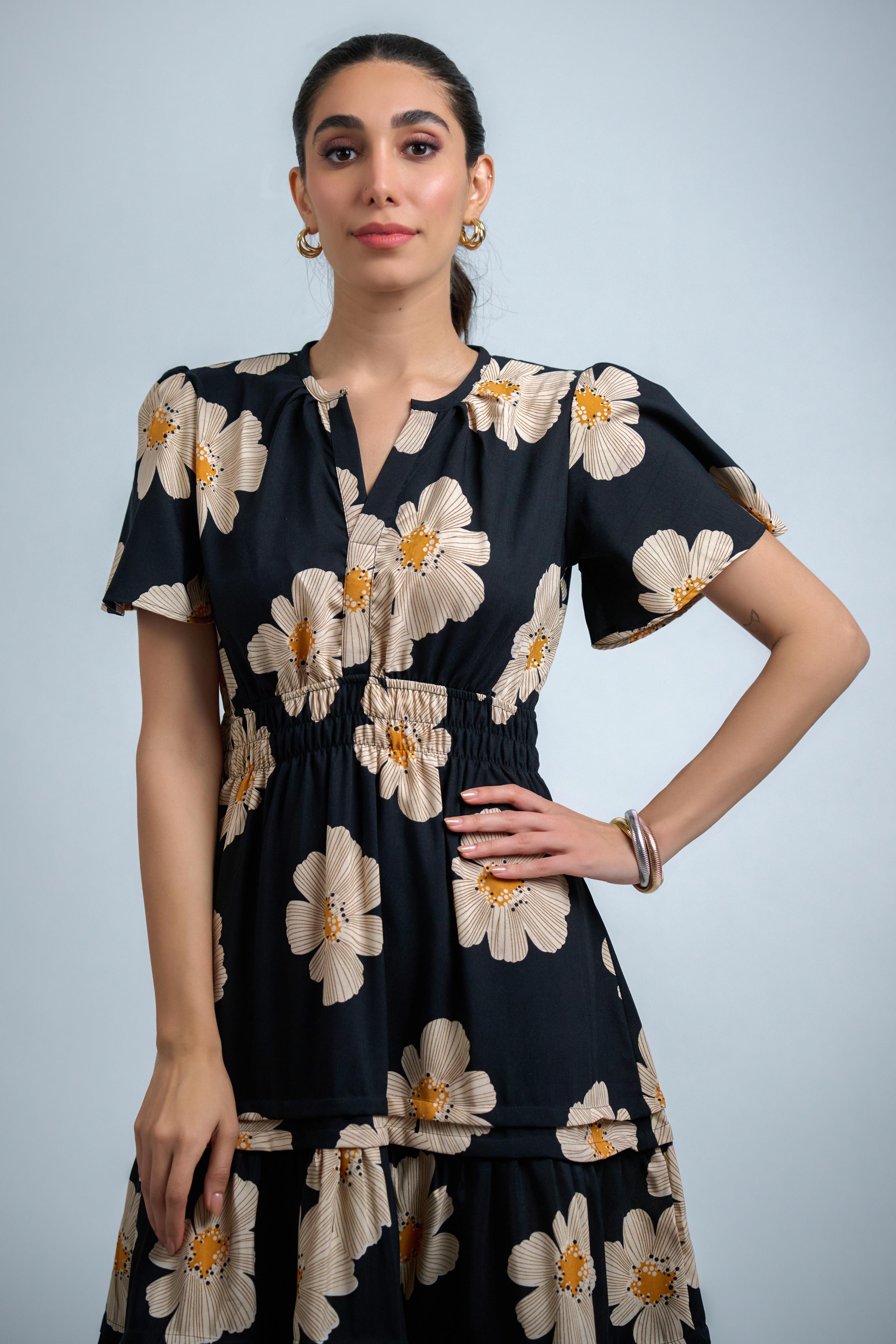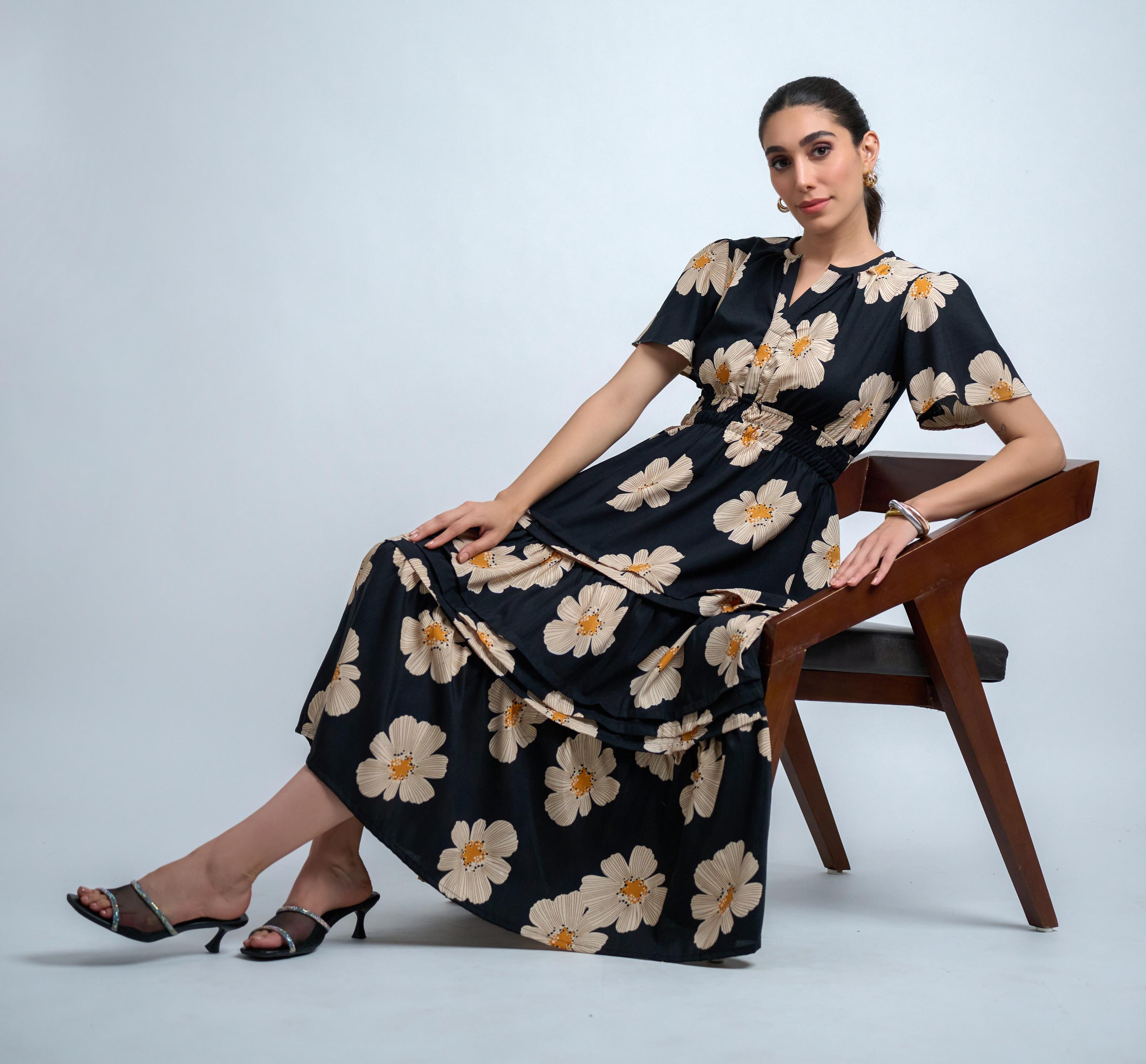 Black Beige Poly Rayon Floral Print Regular Sleeve Dress