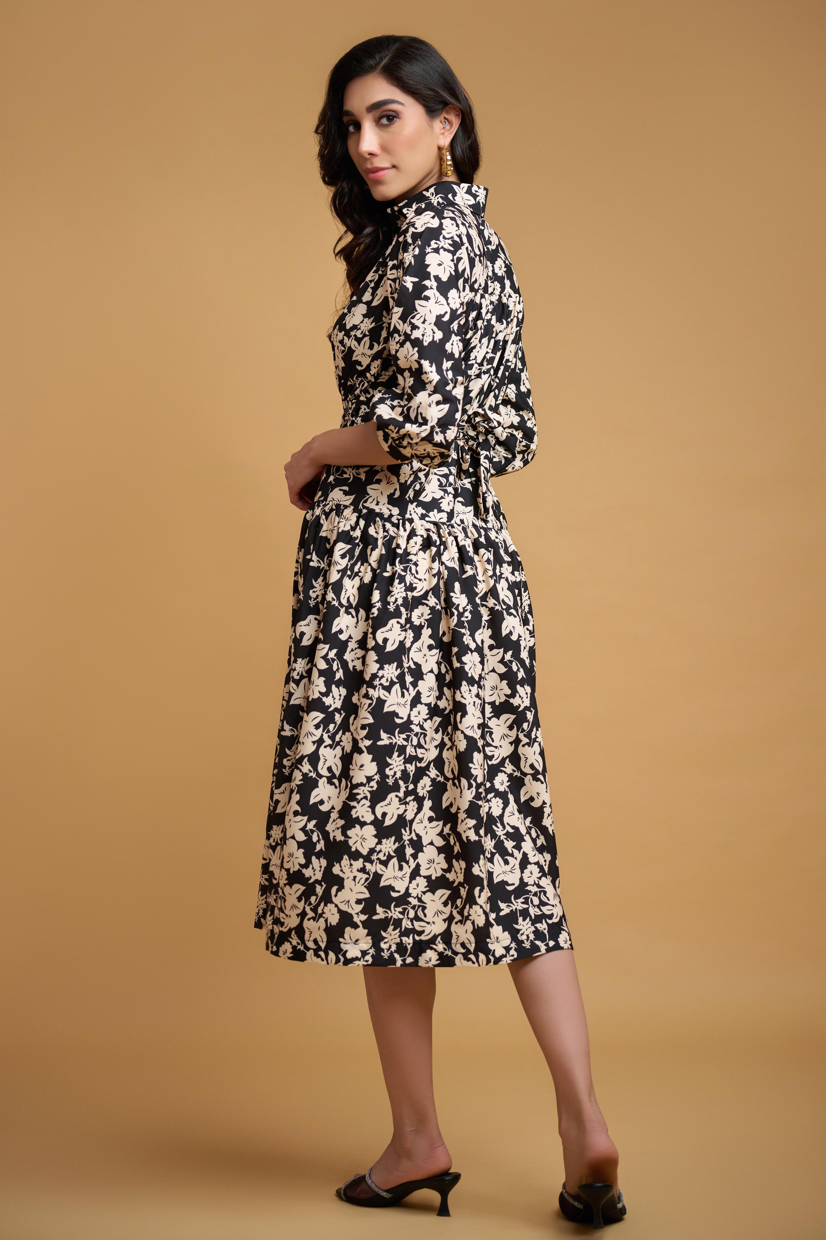 Black Cream Poly Crepe Floral Print Regular Sleeve Dress