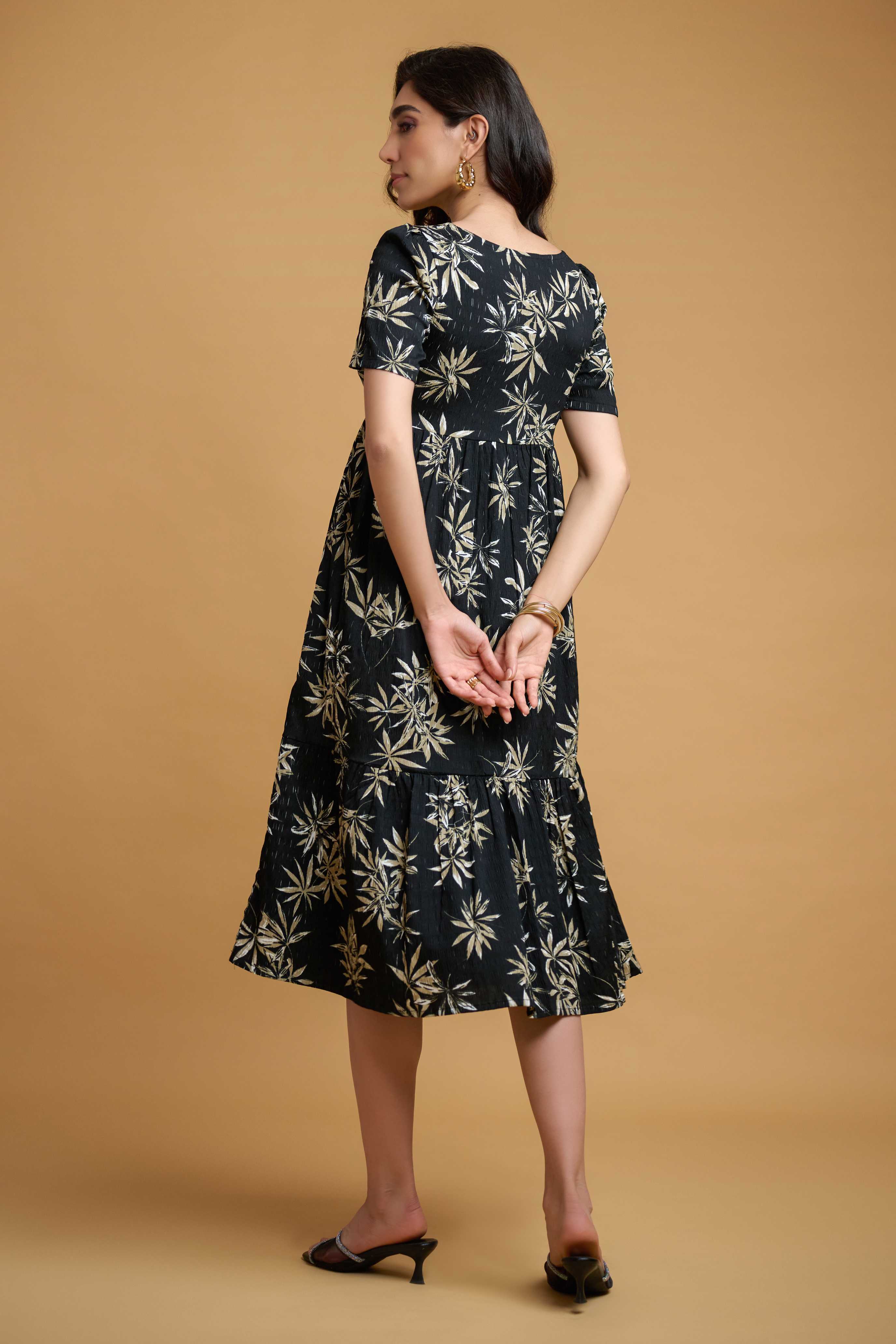 Black-Yellow Poly Lycra Regular Sleeve Leaf Print Dress