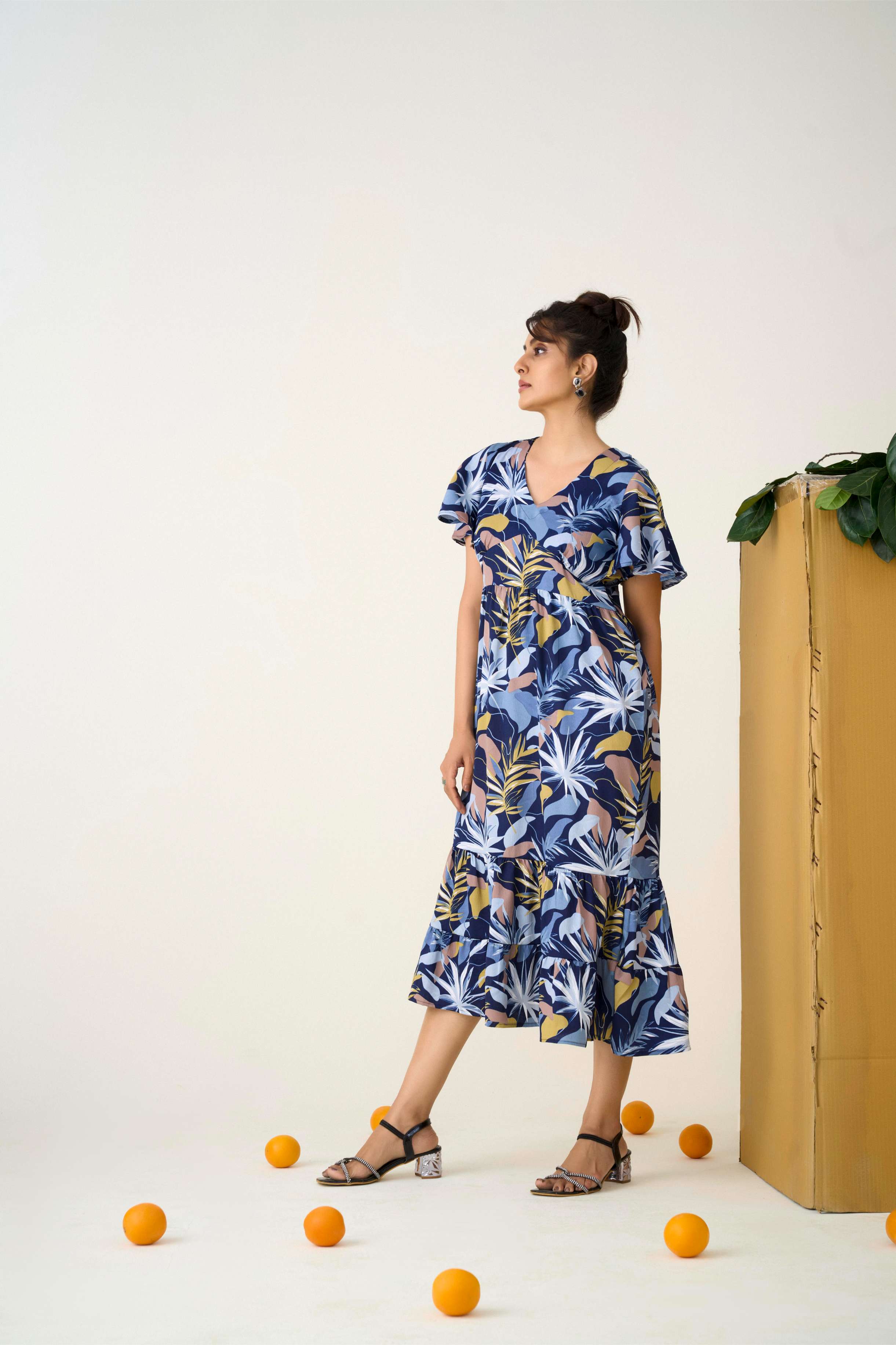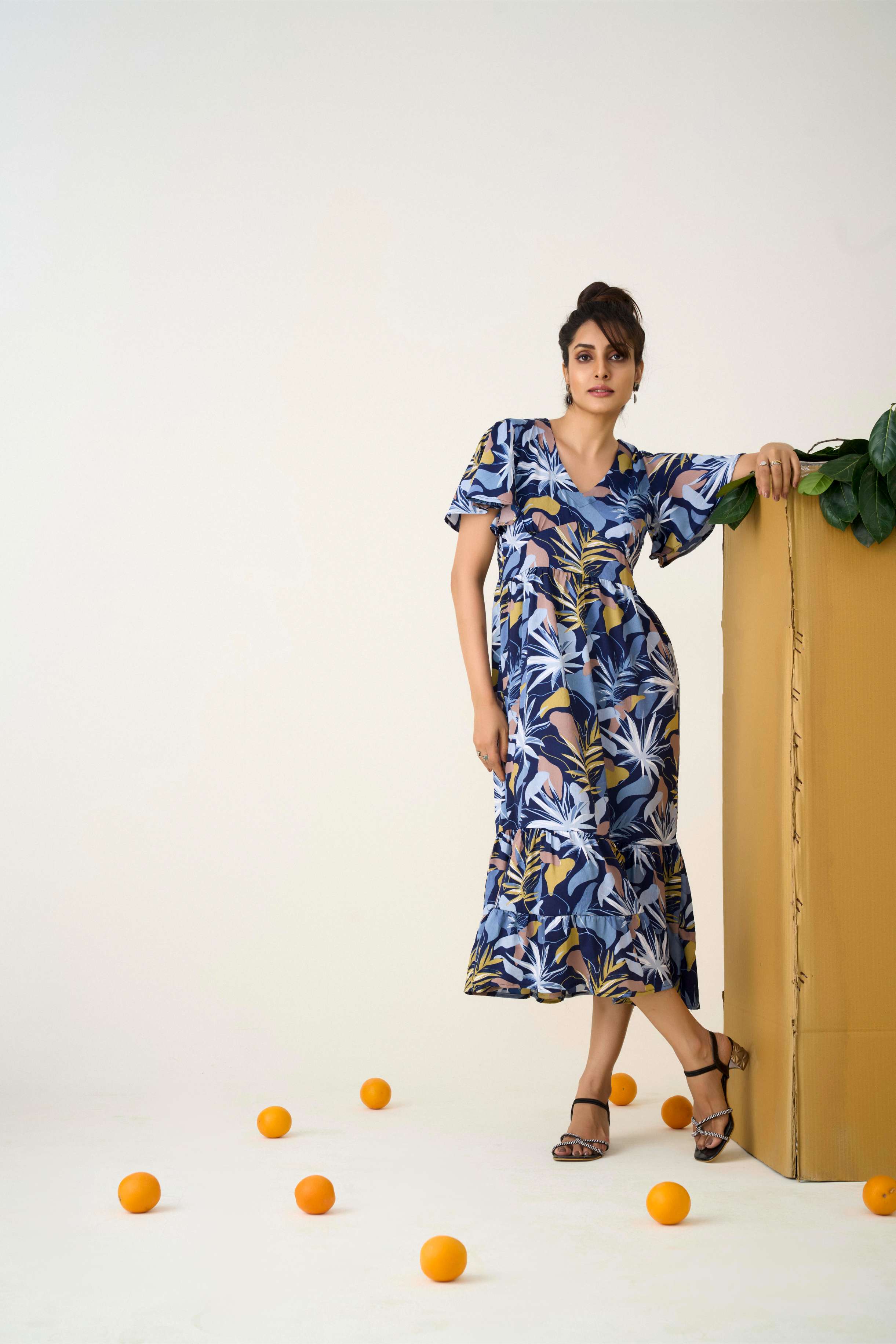 Blue Poly Crepe Flutter sleeves Tropical Floral Print Dress