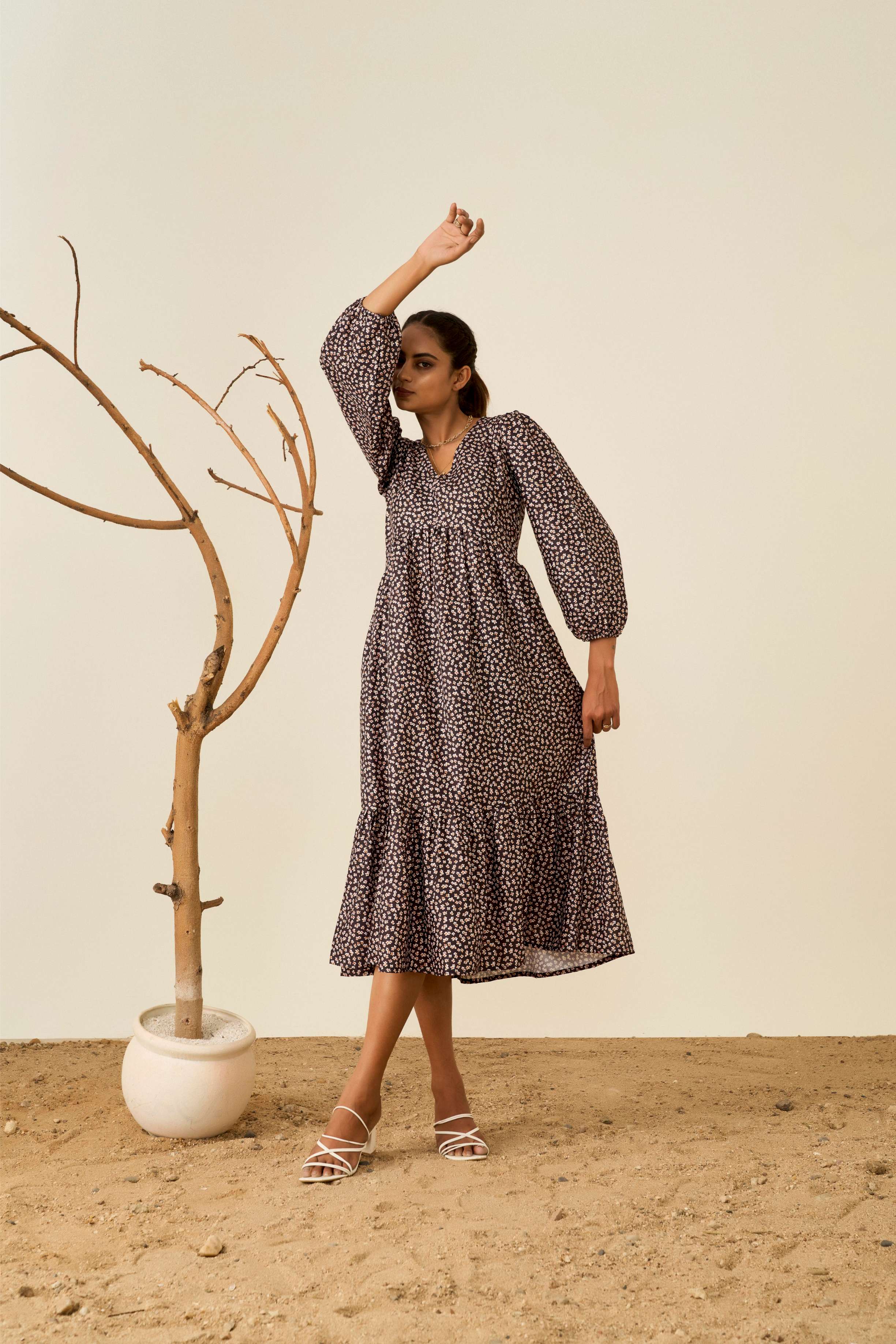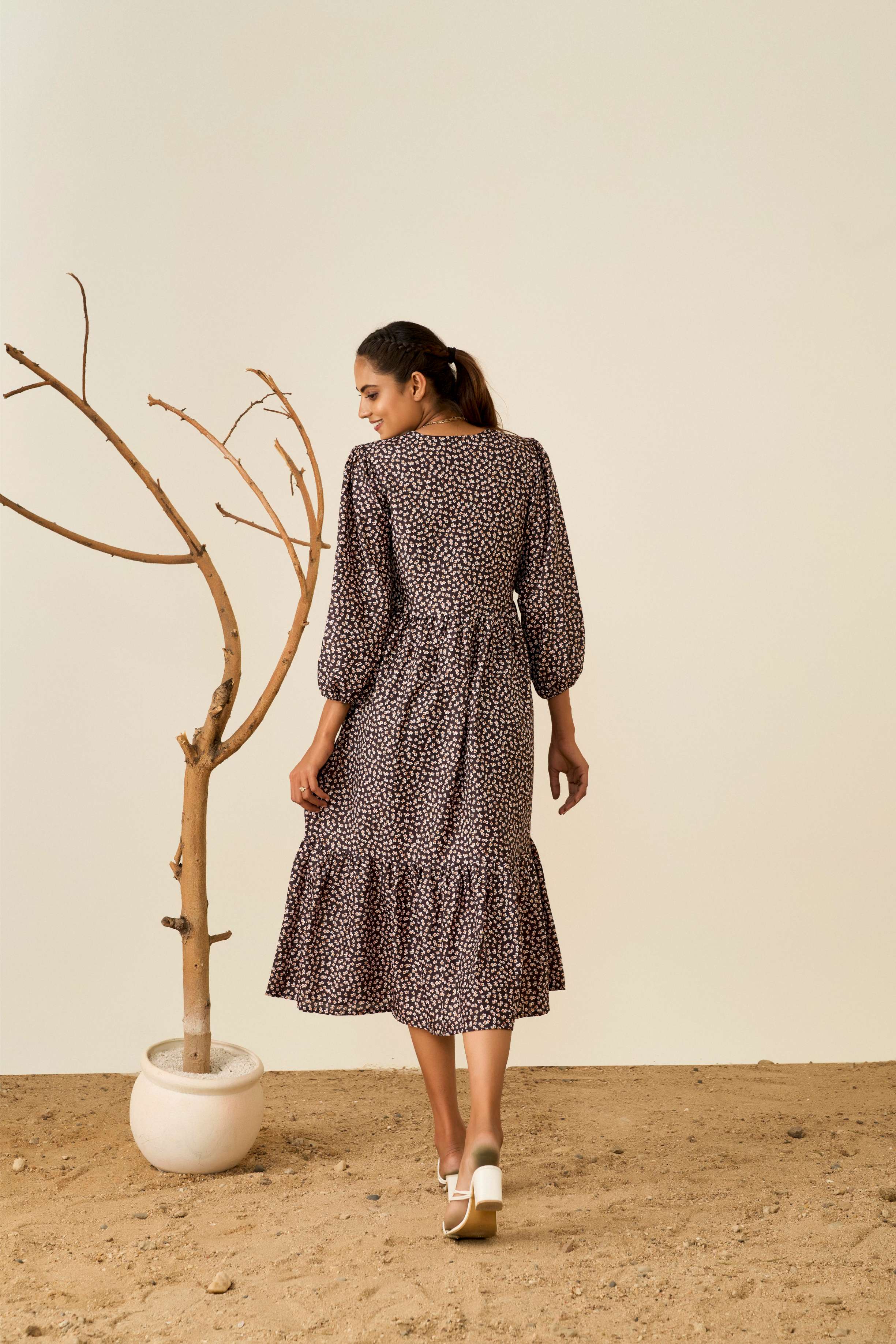 Brown Poly Crepe Balloon Sleeves Floral Print Dress
