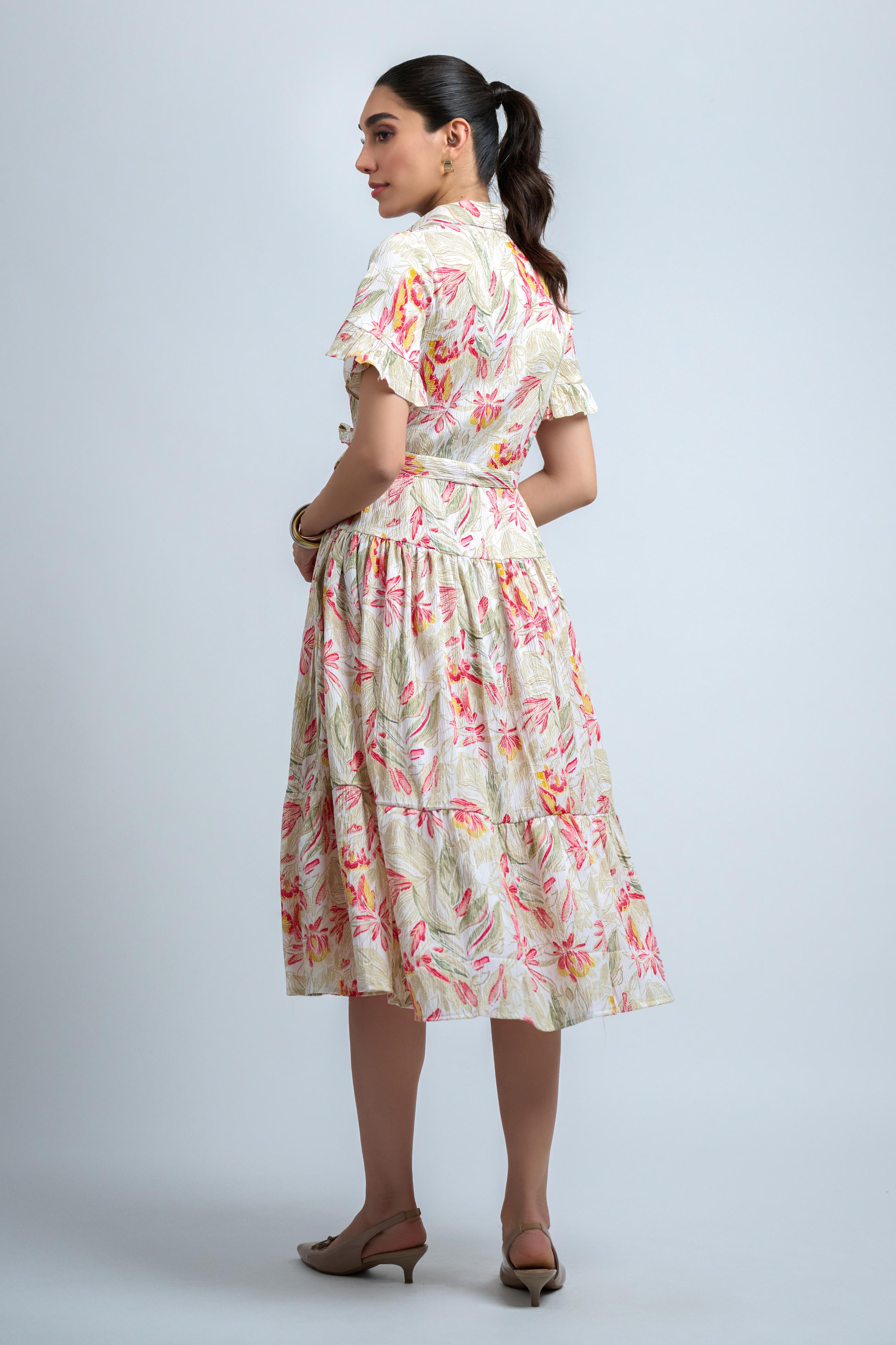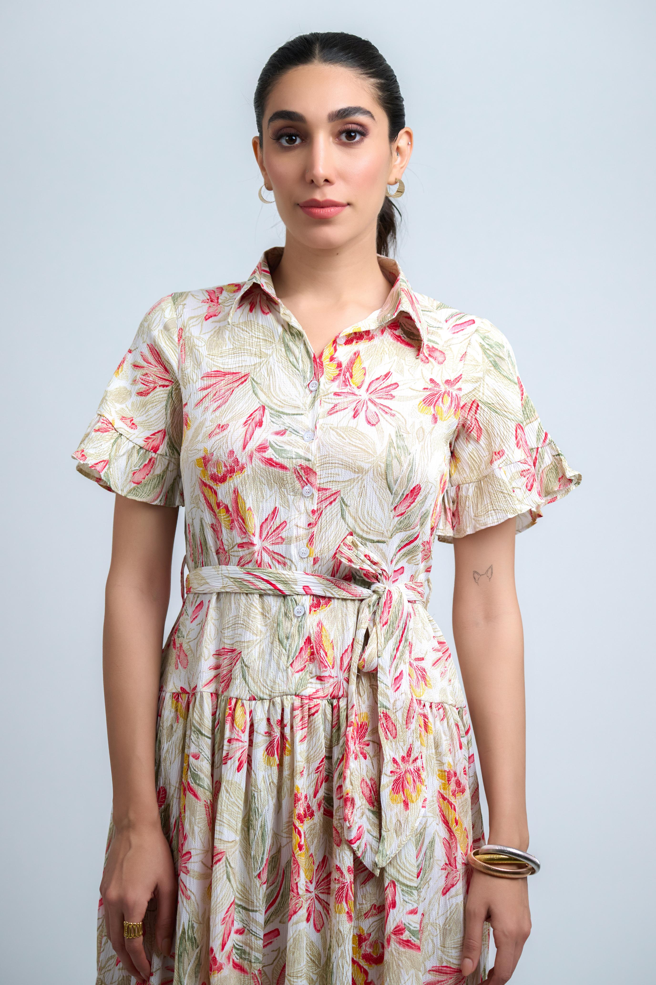 Cream-Pink Poly Crepe Floral Print Ruffle Sleeve Dress