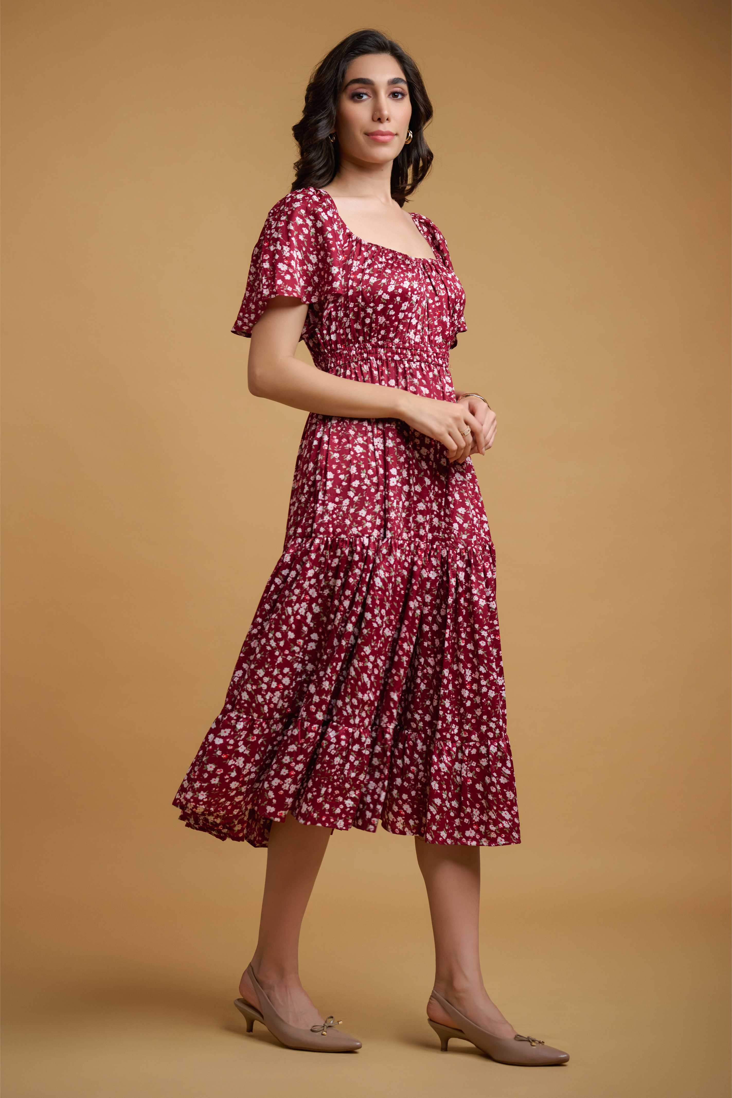 Maroon Poly Crepe Ruffle Sleeve Floral Print Dress