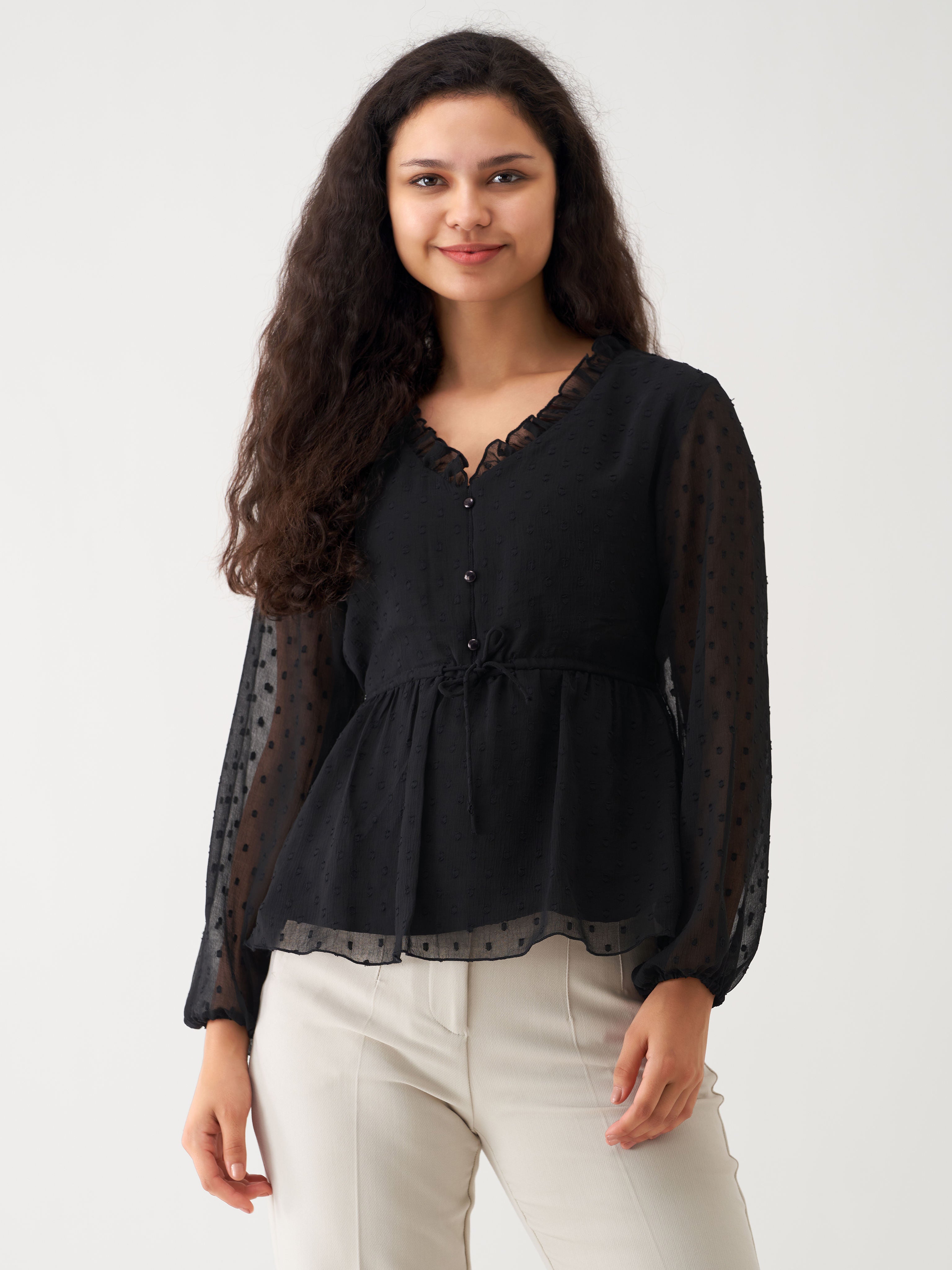 Ravishing Black Swiss Dot Chiffon Top with Ruffle Sleeves - Elegant & Versatile Top