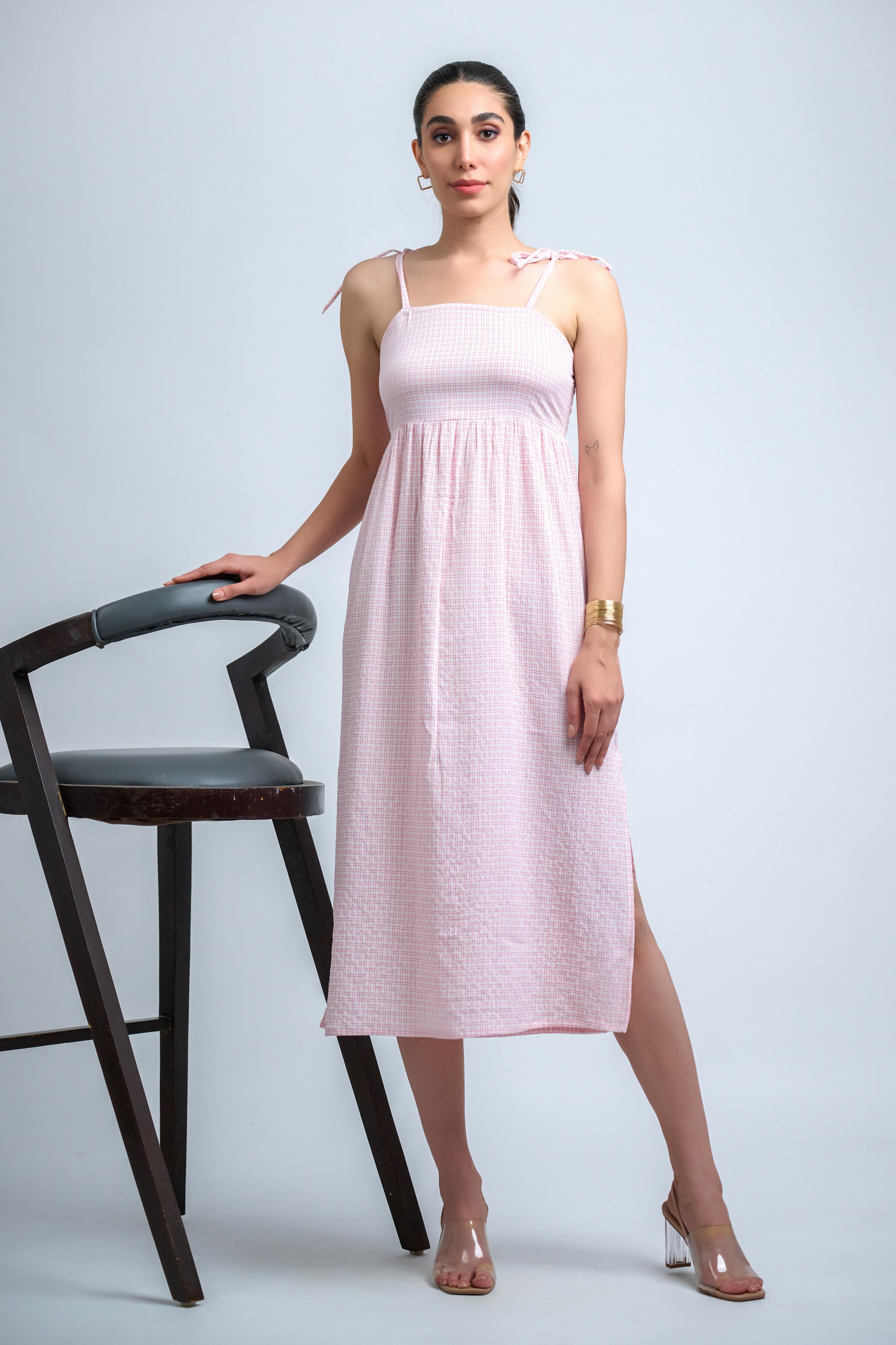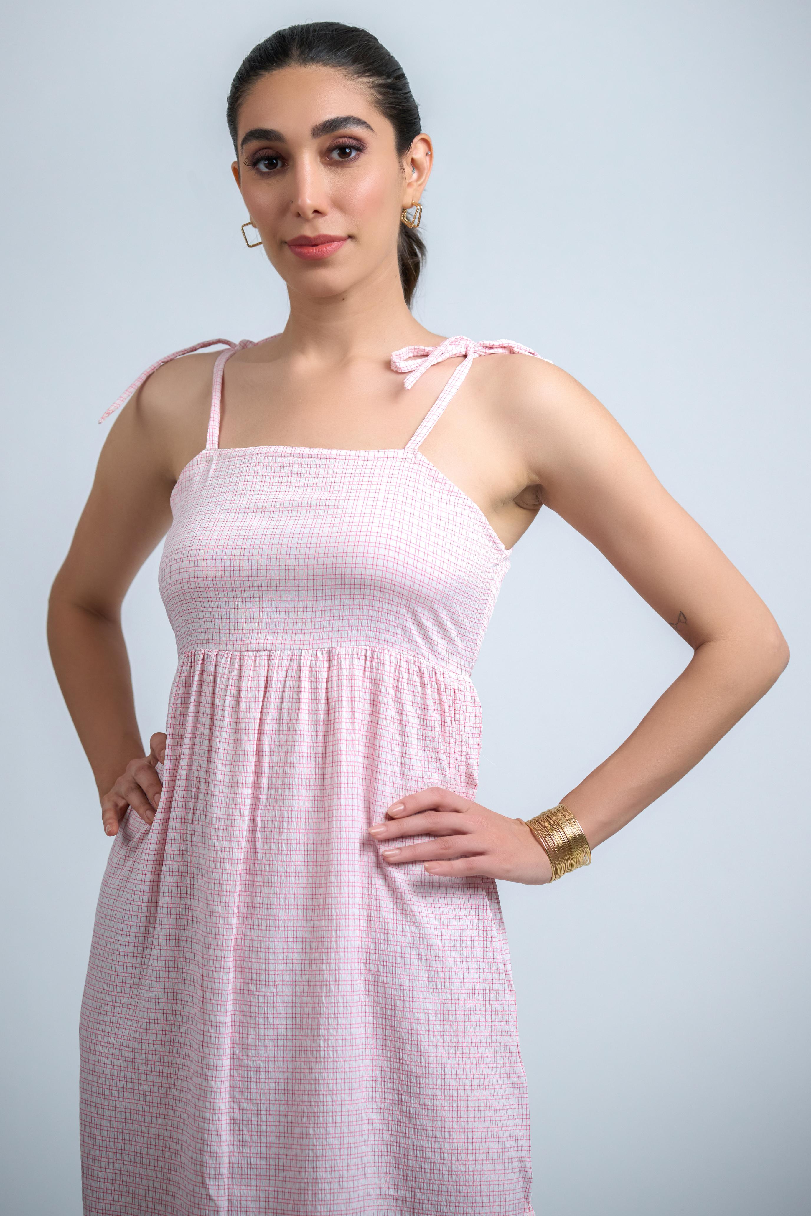 White Pink Poly Crepe Checkered Spaghetti Strap Dress